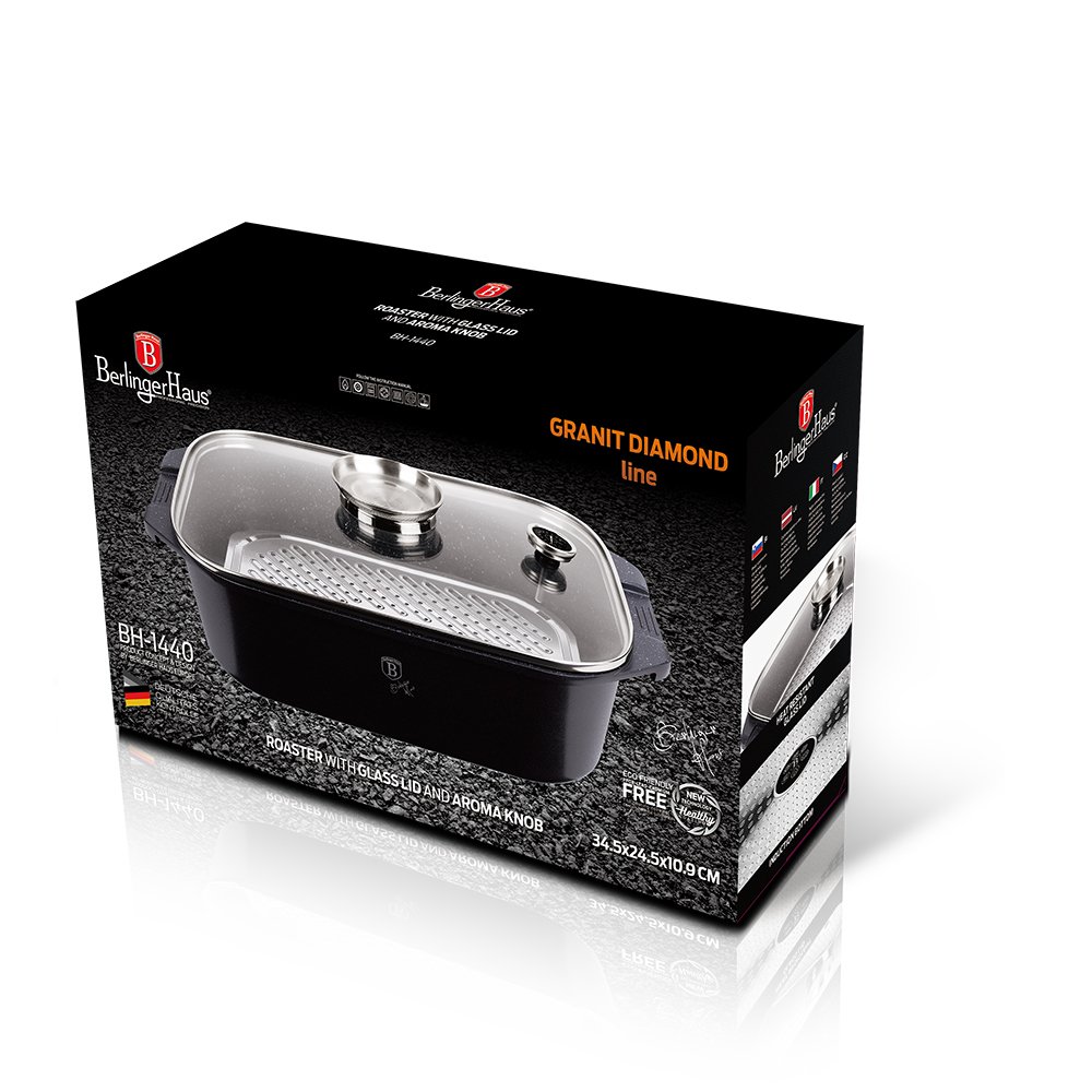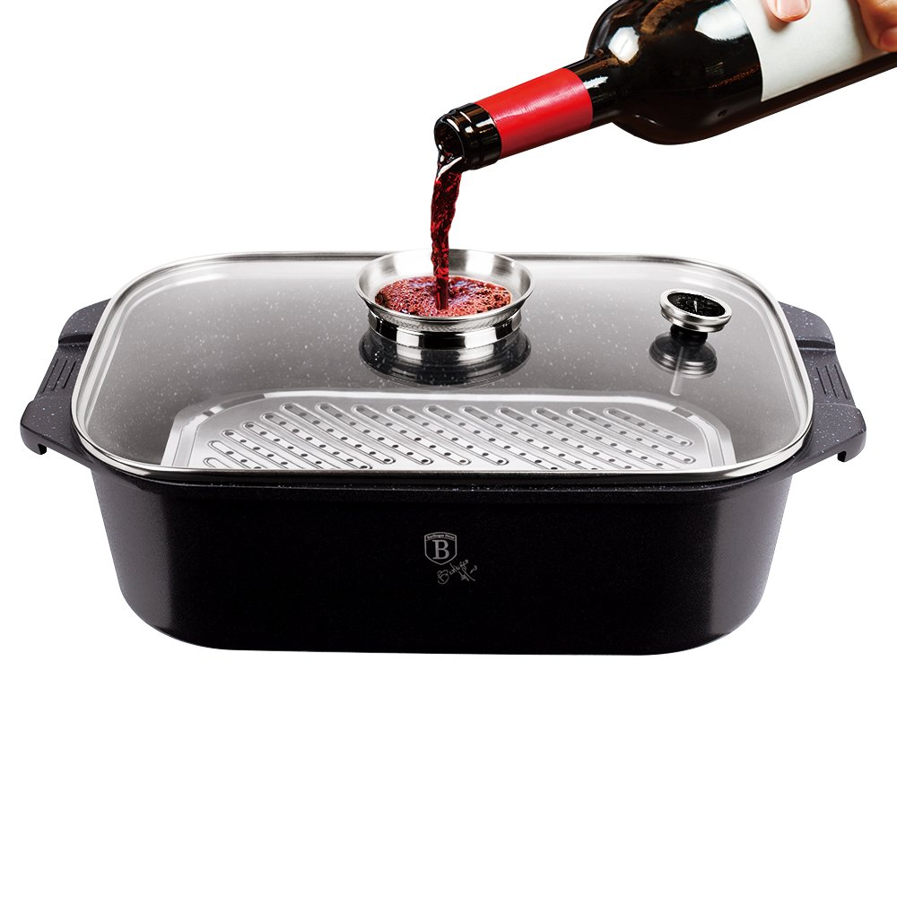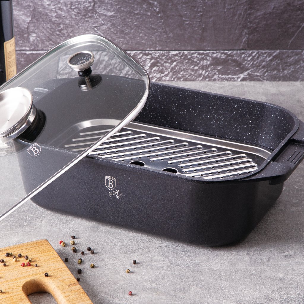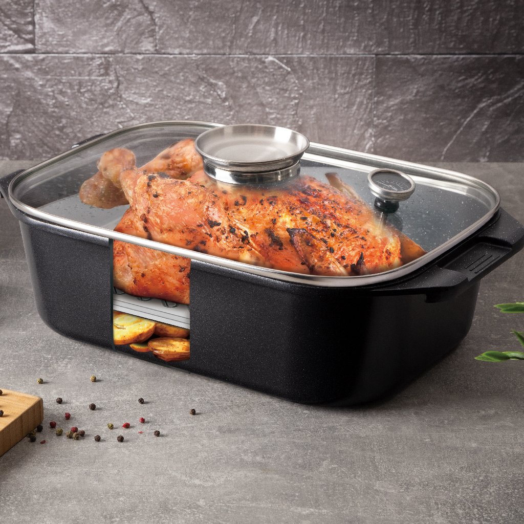 Funkcionalen pekač primeren za vse vrste štedilnikov, vključno z indukcijo. Pokrov iz kaljenega stekla z dozirnim ročajem iz nerjavečega jekla (Aroma Knob). Zahvaljujoč inovativnemu ročaju Aroma Knob lahko v ponev priročno dozirate začimbe ali oljčno olje, kot je aromatizirano olje. Hrana bo ostala sočna in se ne bo zažgala. V pokrovu je termometer, ki omogoča nadzor temperature v posodi. V kompletu je dodatna rešetka na katero lahko položimo pečenko tako, da se ne dotika dna posode. To ustvari kroženje vročega zraka okoli celotne posode. Žar se lahko uporablja tudi za večplastno peko dvokomponentnih jedi, kot so meso in zelenjava ali krompir.