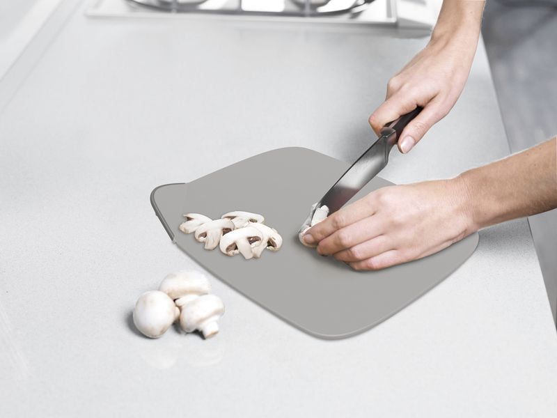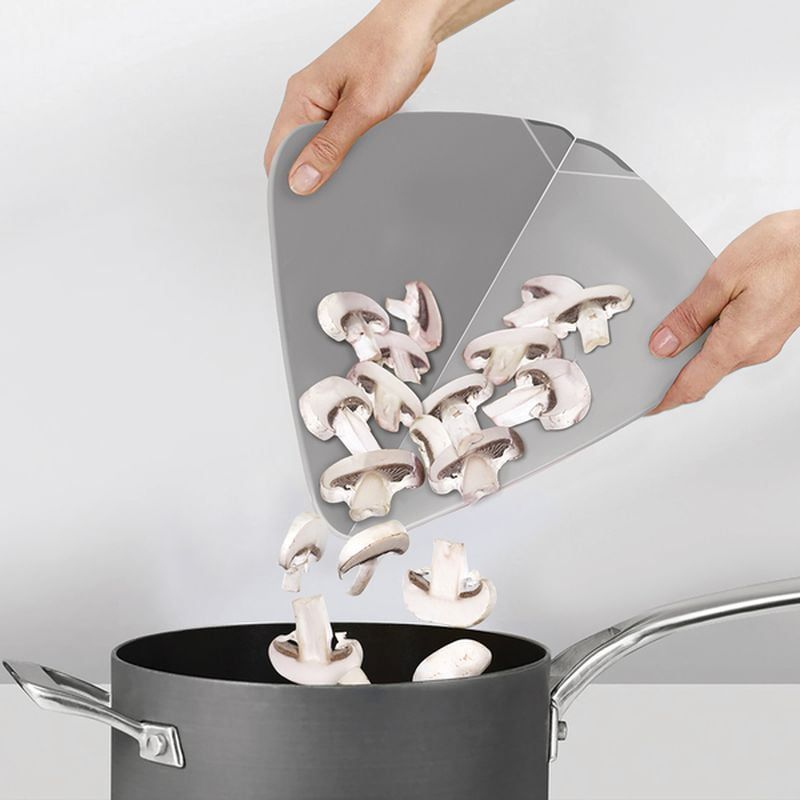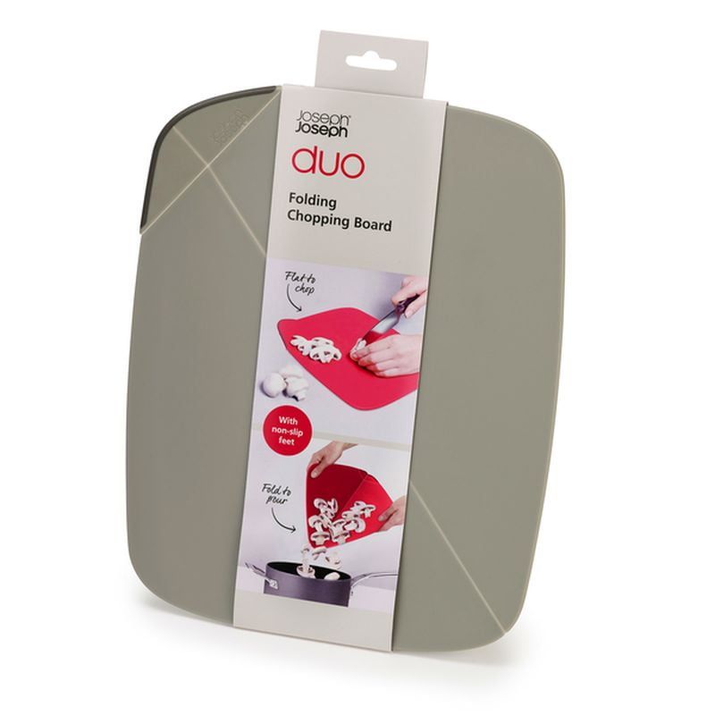 JosephJoseph Duo deska za rezanje je idealna za rezanje mesa, sadja, zelenjave ali začimb. Po uporabi le stisnite ročaj, da naredite lijak in na najpreprostejši način prenesite narezano sadje ali zelenjavo ali meso v lonec ali ponev.