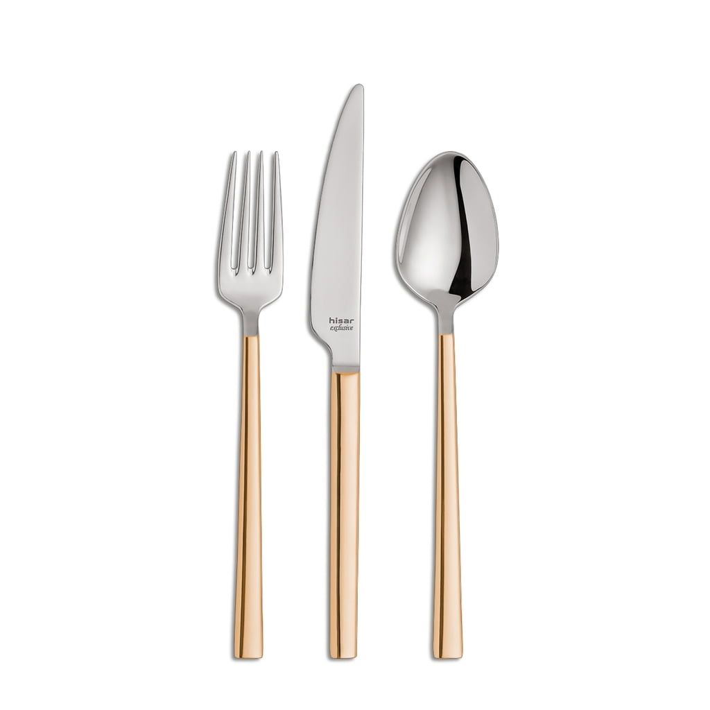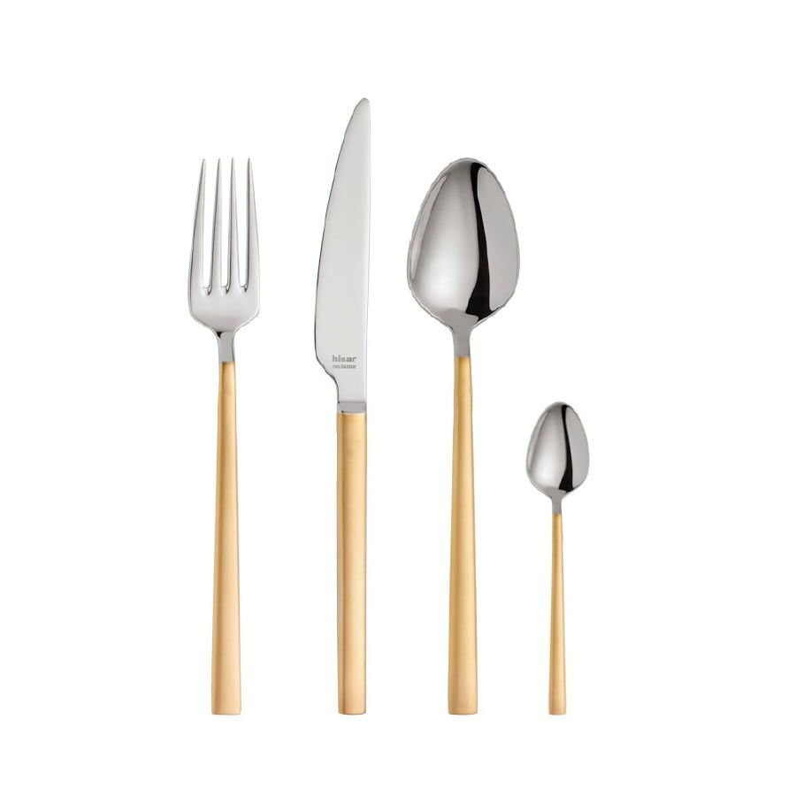 30 delni jedilni pribor Milan Goldenline HISAR iz nerjavečega jekla 18/10, debeline 4 mm. Pribor je sestavljen iz 6 kompletov žlic, vilic, nožev, desertnih žlic in desertnih vilic.