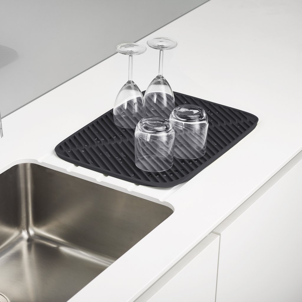 Ta praktična podloga ima mehko gumijasto površino za odcejanje različnih stvari in je kot nalašč za ustvarjanje dodatnega prostora za odcejanje, ko je to potrebno.; Zložljiva oblika omogoča enostavno spuščanje v umivalnik.; Mehka gumijasta površina ščiti posodo in kozarce pred umazanijo in praskami.; Vzporedna rebra preprečujejo zadrževanje vode v zasukanih odprtinah posode.; Obrišite z vlažno krpo. Po uporabi temeljito posušite, da preprečite nastanek plesni. Ne dovolite, da izdelek ostane moker dlje časa. Vedno shranjujte ravno.; Brez BPA.; Dimenzije 43,5×31,5 cm.