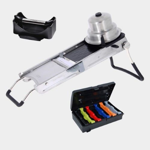 Novo dvojno vodoravno rezilo za rezanje zelenjave in sadja Revolution Master Mandolina De Buyer, tudi mehkega sadja, kot sta lupina citrusov in paradižnika. Sestavljen je iz snemljive sklede in 6 podaljškov julienne: 2, 3, 4, 5, 7 in 10 mm, primernih za rezanje na kocke, trakove, plošče, valovite plošče in različne druge oblike. Debelina plošče do 10 mm. Ohišje iz nerjavečega jekla, primerno za pomivanje v pomivalnem stroju in rezila ročno operemo pod mlačno vodo.
