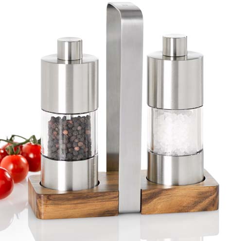 Izjemno lep, praktičen in kvaliteten set mlinčkov za sol in poper z lesenim podstavkom in držalom iz nerjavečega jekla. Keramično rezilo CeraCut. Višina brusov 13 cm, premer 4,5 cm.