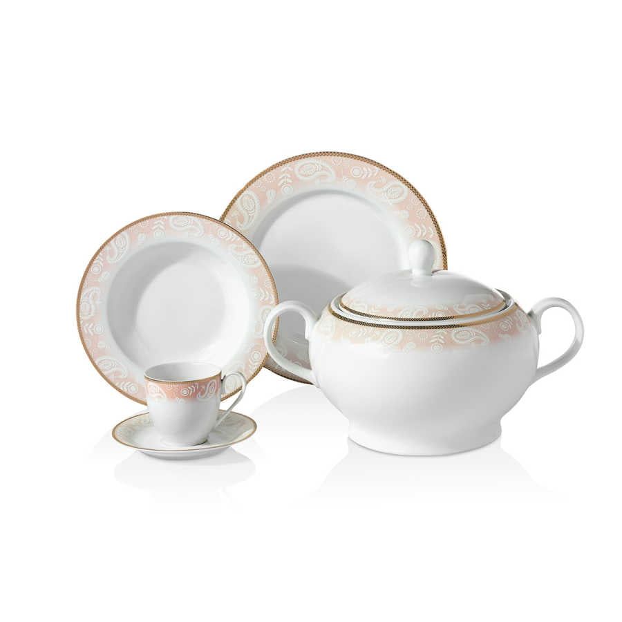 Set je sestavljen iz: 12 servirnih krožnikov, 12 plitvih krožnikov za večerjo, 12 desertnih krožnikov, 12 skledic za juho, 6 setov za kavo, 6 setov za čaj, 1 krožnik s premerom 32 cm, 2 krožnika s premerom 22 cm, 1 posoda za juho s pokrovom, 1 držalo za prtičke, 2 seta za sol in poper ter 2 posodici s pokrovom za zobotrebce.